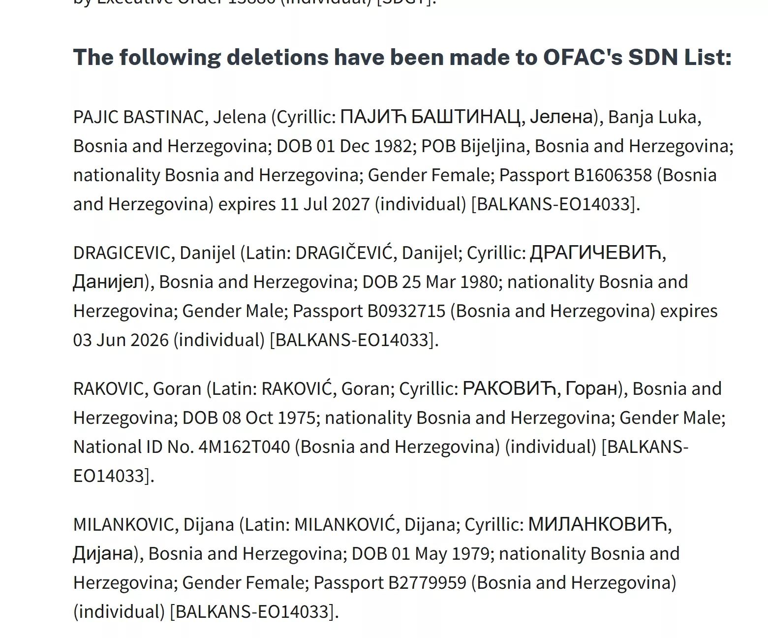 (Patria) - Ured za kontrolu strane imovine (OFAC) američkog Ministarstva finansija uklonio je sa svoje liste sankcionisanih osoba četvero saradnika bivšeg predsjednika Rs Milorada Dodika.