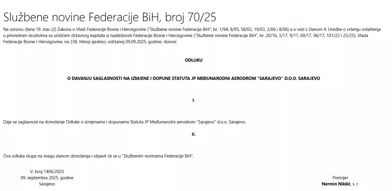 U Službenim novinama FBiH 70/25 od 12. septembra objavljena je odluka kojom je Vlada FBiH dala saglasnost na donošenje Odluke o izmjenama i dopunama Statuta JP Međunarodni aerodrom "Sarajevo" d.o.o. Sarajevo. Vlada FBiH je hitnu sjednicu održala 9. septembra, a na istoj sjednici Vlada je dala ovlaštenje Tomislavu (Mile) Stapiću da, u svojstvu punomoćnika, zastupa Vladu Federacije Bosne i Hercegovine na 95. sjednici Skupštine J.P. Međunarodni aerodrom "Sarajevo" d.o.o. Sarajevo koja je održana 10. septembra i na kojoj su usvojene izmjene i dopune Statuta.
