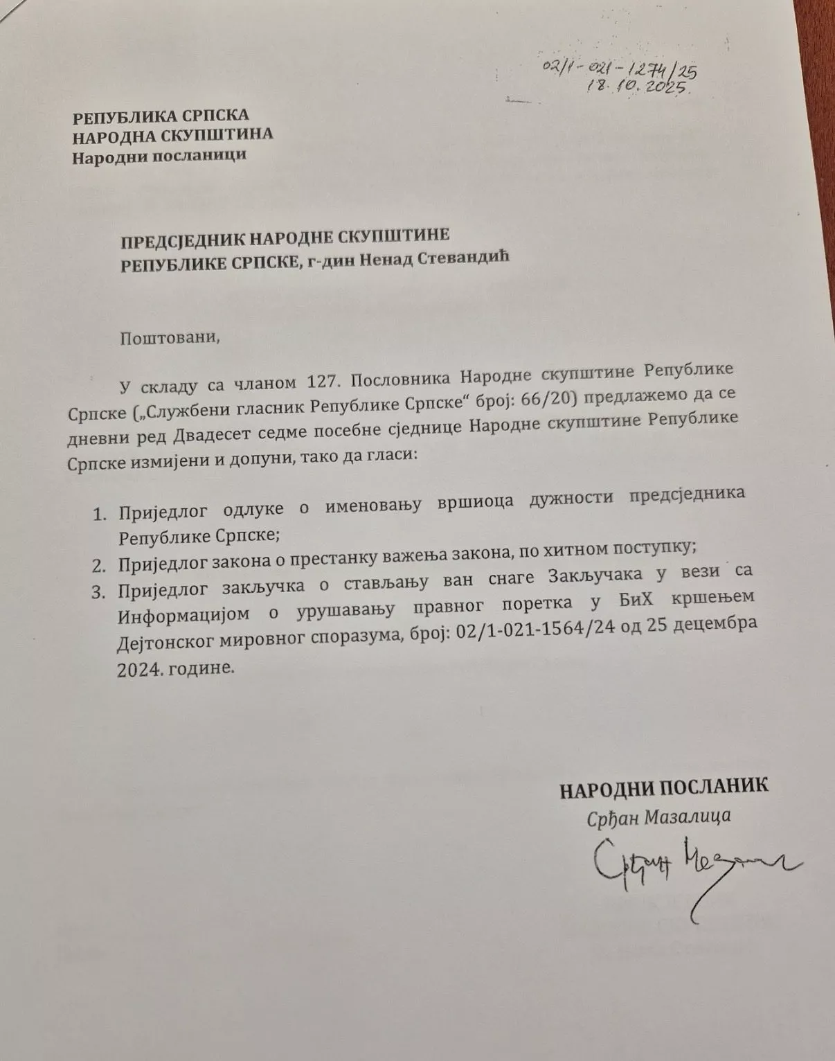 Šef Kluba SNSD-a Srđan Mazalica zatražio je dopunu dnevnog reda današnje 27. sjednice.