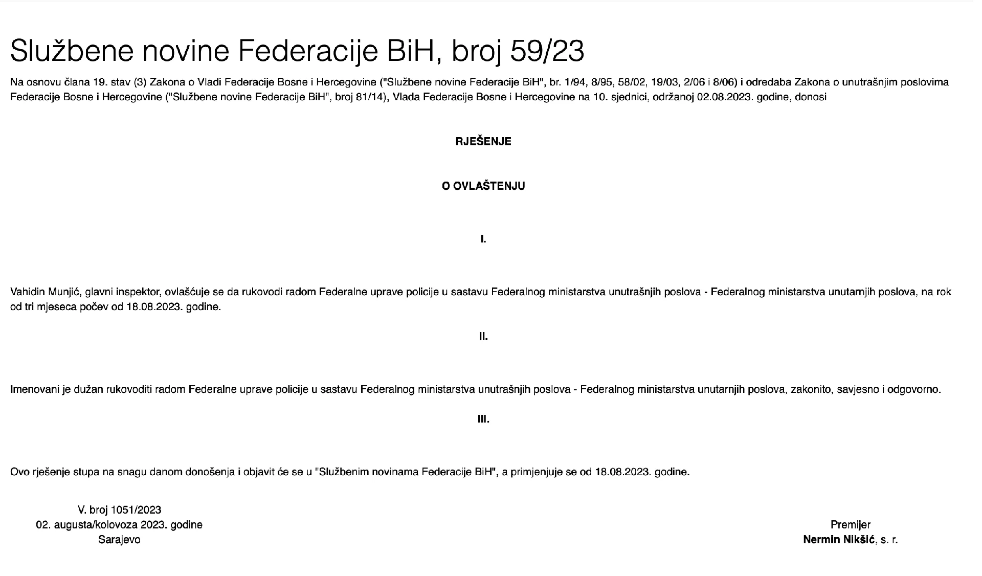 Evo Rješenja kojim je Nikšić ovlastio Munjića da bude još tri mjeseca v.d. direktora FUP-a.