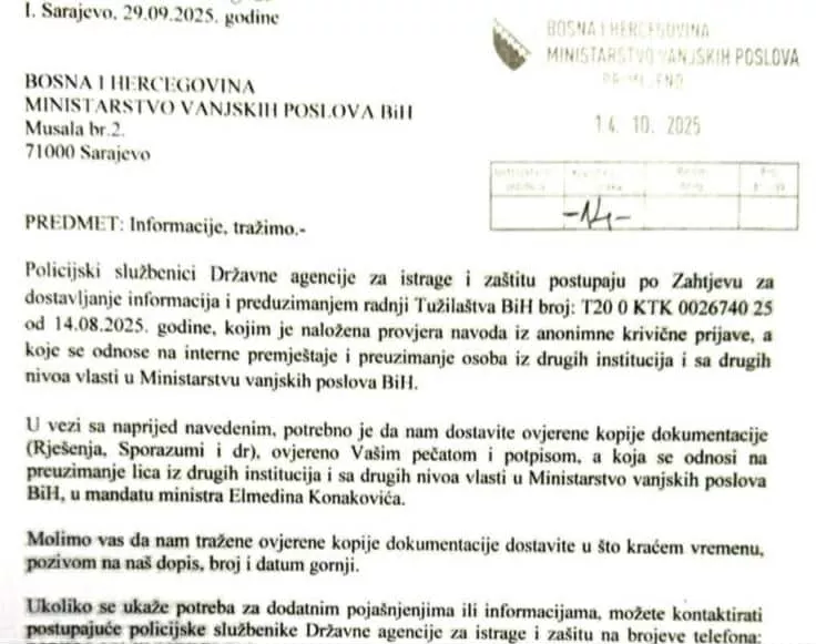 Tako je u MVP 14. oktobra zaprimljen zahtjev Državne agencije za istrage i zaštitu (SIPA) kojim se od MVP BiH traži dostavljanje ovjerenih kopija dokumentacije (rješenja, sporazumi i drugo) ovjereno pečatom i potpisom, a koja se odnosi na preuzimanje lica iz drugih institucija i sa drugih nivoa vlasti.