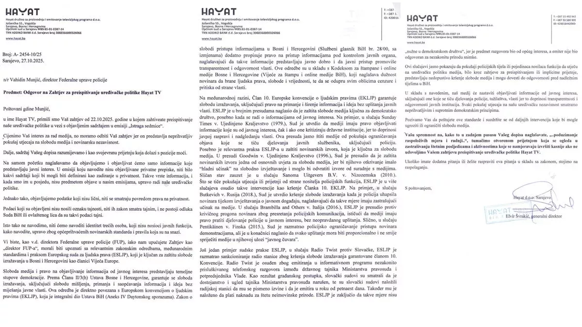 u ime Hayat TV, primili smo Vaš zahtjev od 22.10.2025. godine u kojem zahtijevate preispitivanje naše uređivačke politike u vezi s objavljenim sadržajem u emisiji „Istraga sedmice“.