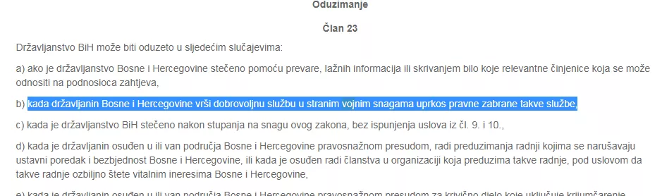 Pored toga, član 23. Zakona o državljanstvu BiH predviđa mogućnost oduzimanja državljanstva osobama koje, uprkos zakonskoj zabrani, dobrovoljno služe u stranim oružanim snagama.
