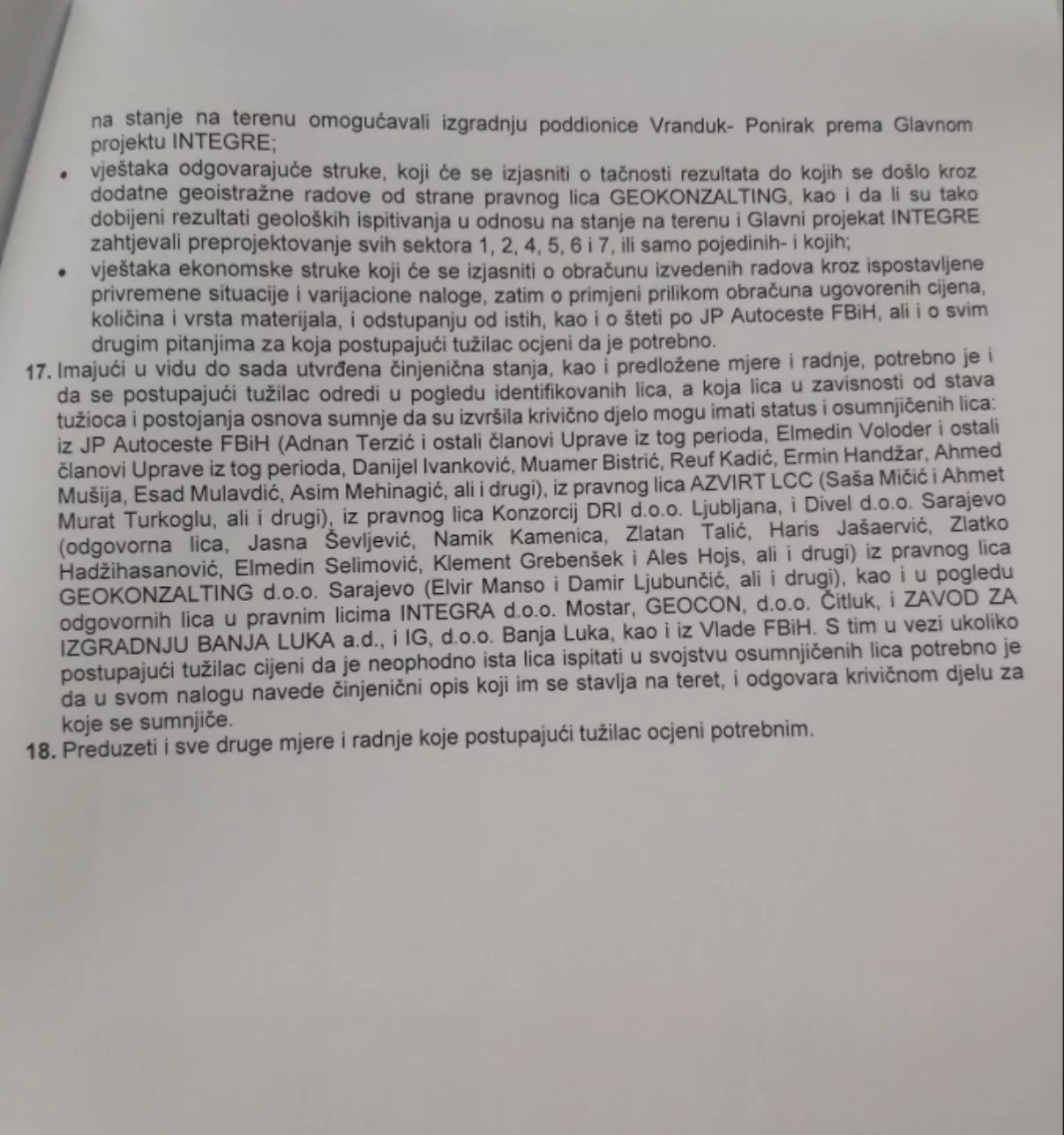 U tom dokumentu, pored ostalog, piše: "Imajući u vidu do sada utvrđena činjenična stanja, kao i predložene mjere i radnje, potrebno je da se postupajući tužilac odredi u pogledu identifikovanih lica, a koja lica u zavisnosti od stava tužioca i postojanja osnova sumnje da su izvršila krivično djelo mogu imati status osumnjičenih lica: iz JP Autoceste (Adnan Terzić i ostali članovi Uprave iz tog perioda, Elmedin Voloder i ostali članovi Uprave iz tog perioda i drugi.