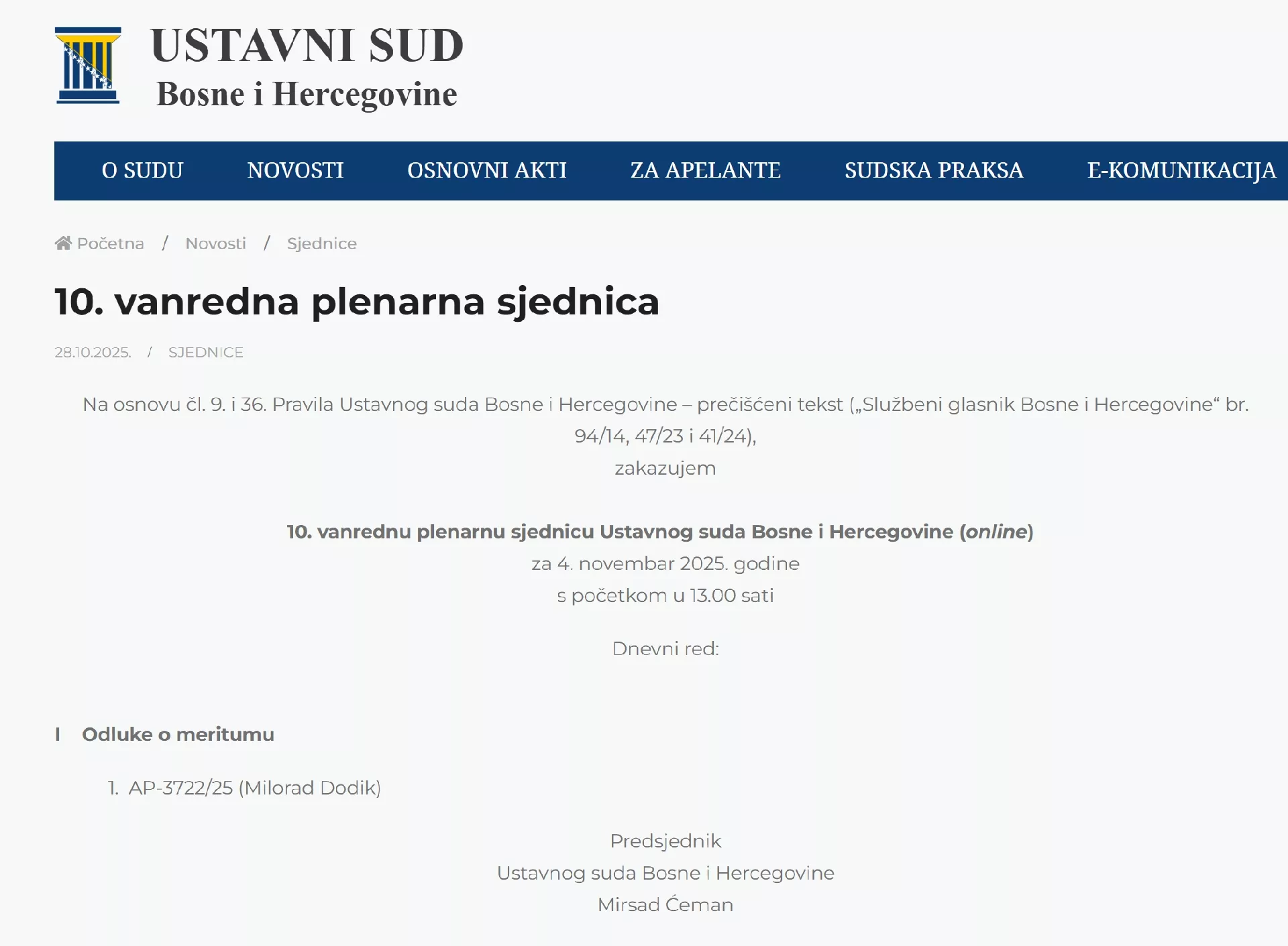 Dodikov advokat Goran Bubić potvrdio je za ATV da je zakazana 10. vanredna plenarna sjednica za 4. novembar sa tačkom dnevnog reda Apelacija u predmetu Milorad Dodik.