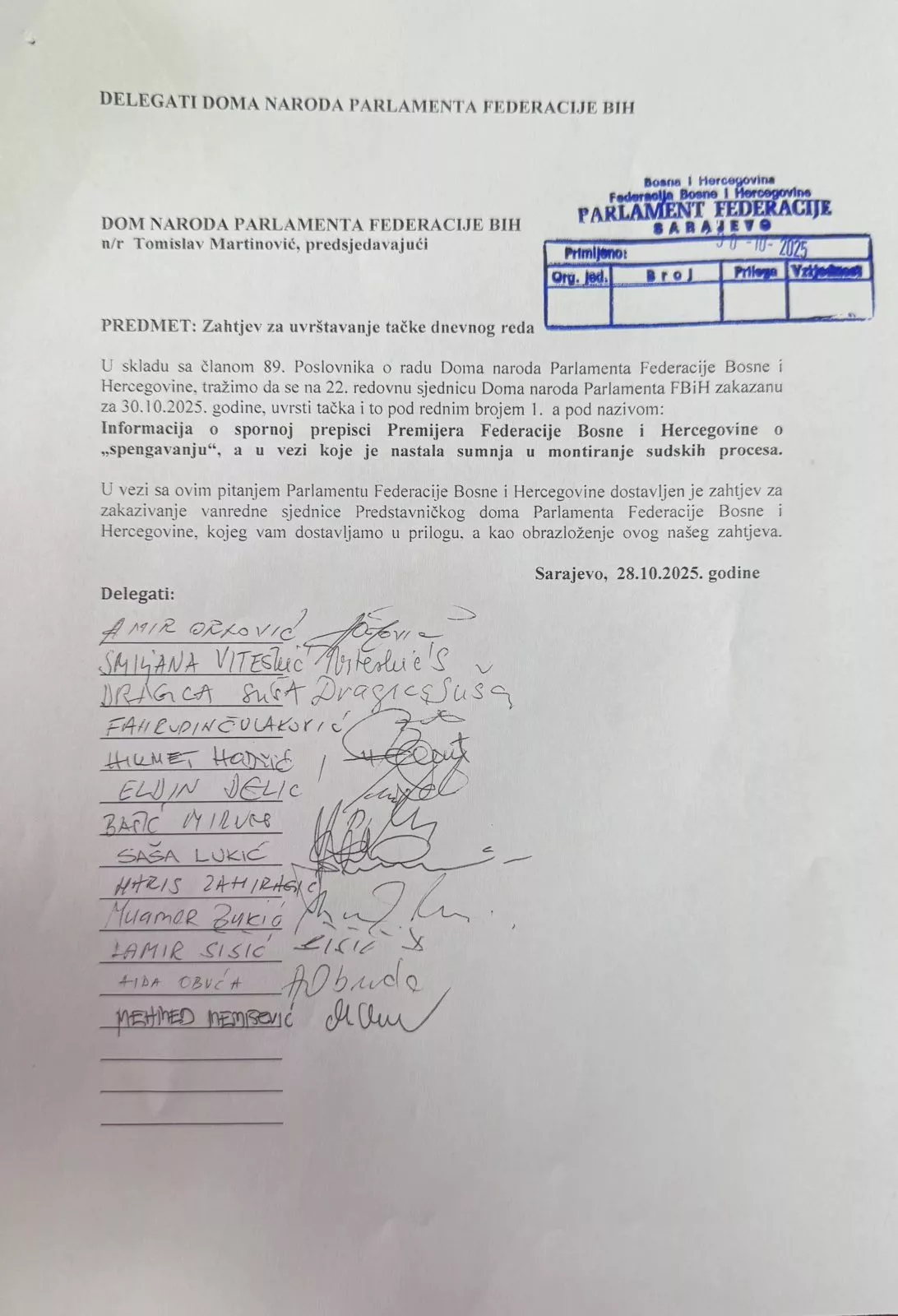 (Patria) - Uoči današnje sjednice Doma naroda Parlamenta Federacije 13 delegata uputilo je zahtjev da se u dnevni red uvrsti tačka "Informacija o spornoj prepisci premijera Federacije Bosne i Hercegovine o "spengavanju", a u vezi koje je nastala sumnja u montiranje sudskih procesa.