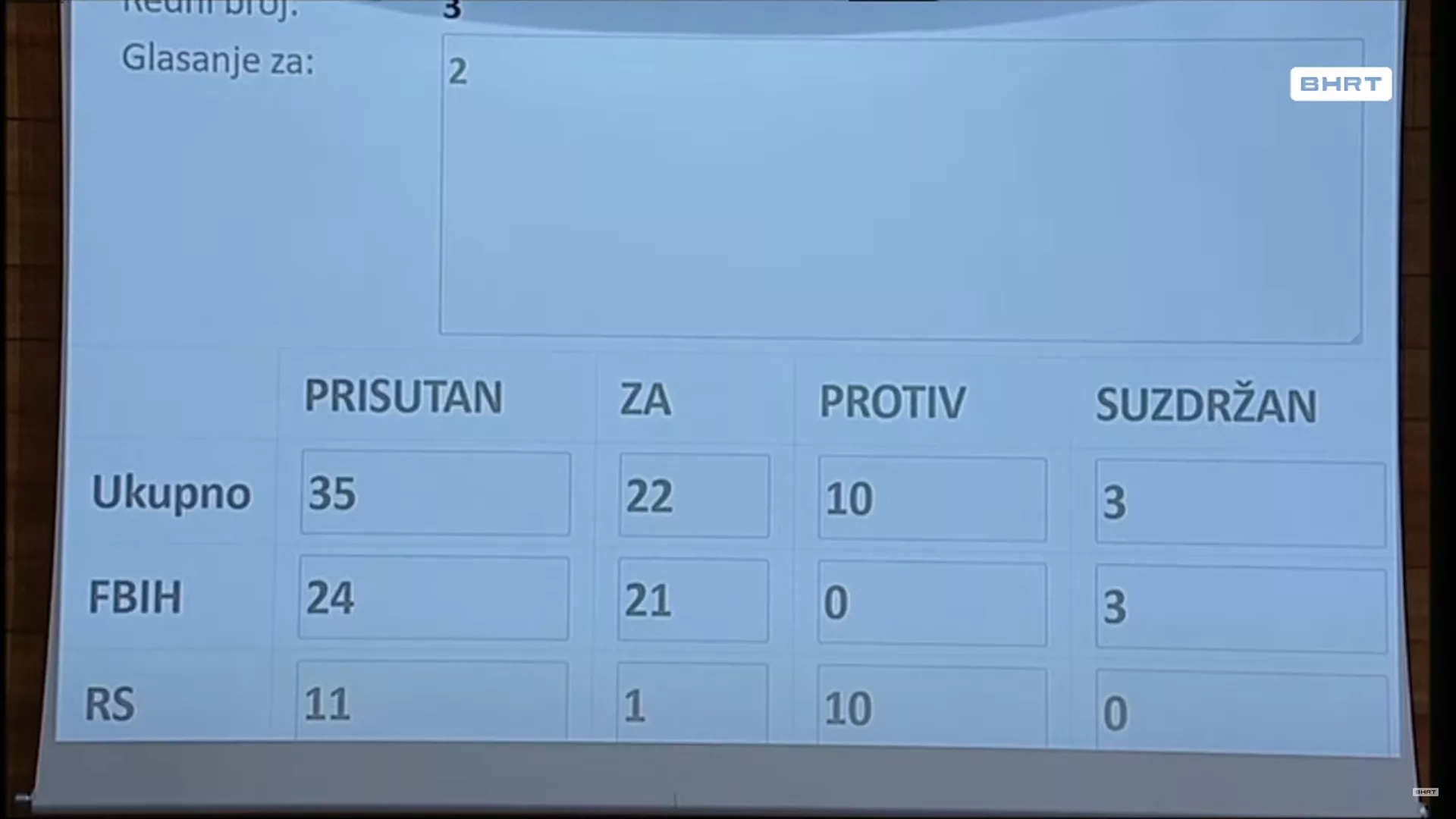 Nije bilo neophodne entitetske većine. Ishod glasanja i u prvom i u drugom krugu bio je identičan. Od ukupno 35 prisutnih zastupnika, "za" su bila 22, 10 je glasalo protiv, a troje je bilo suzdržano.