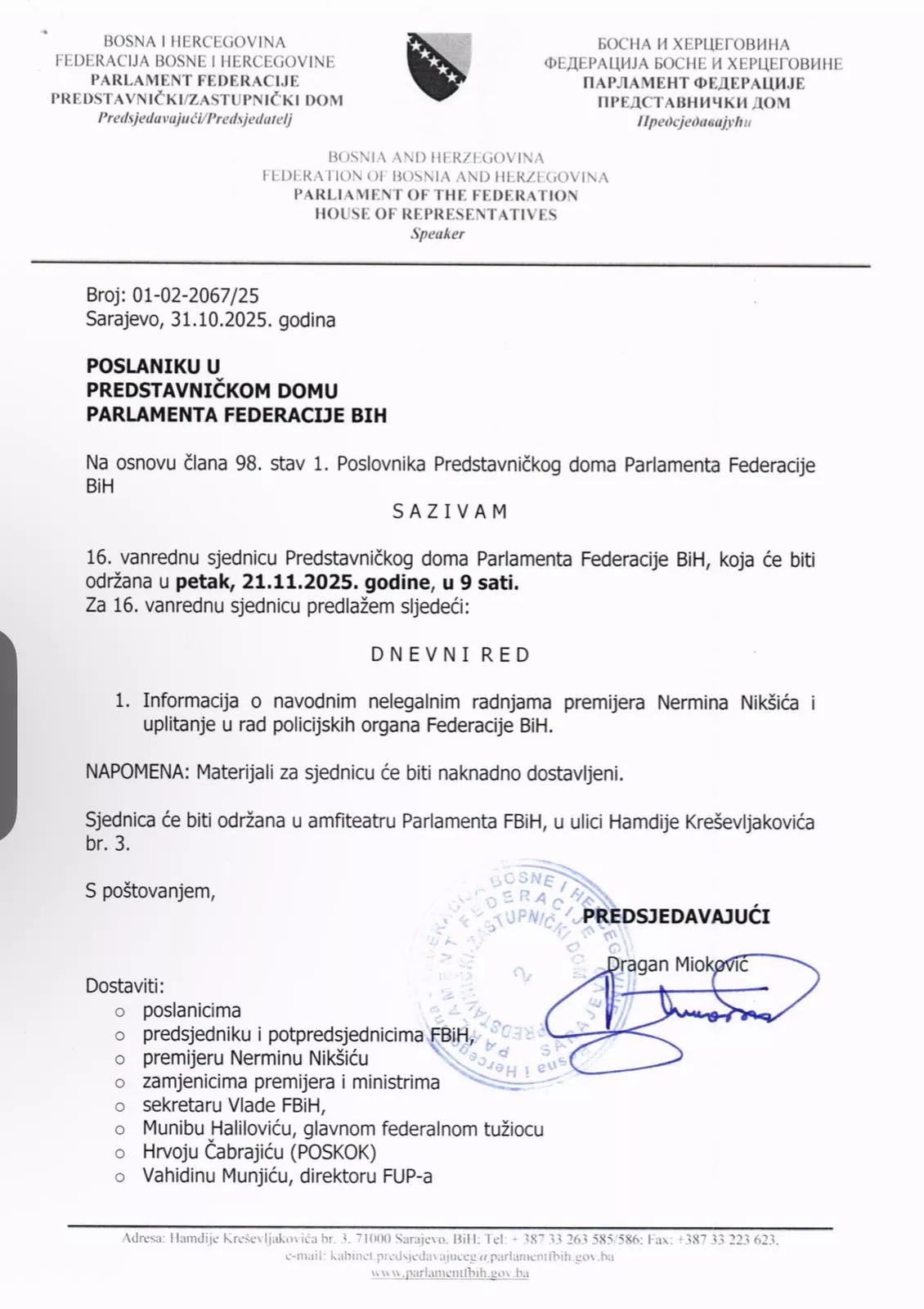 (Patria) - Predsjedavajući Predstavničkog doma Parlamenta FBiH Dragan Mioković zakazao je vanrednu sjednicu ovog doma za 21. novembar, a po zahtjevu 20 zastupnika opozicionih stranaka.