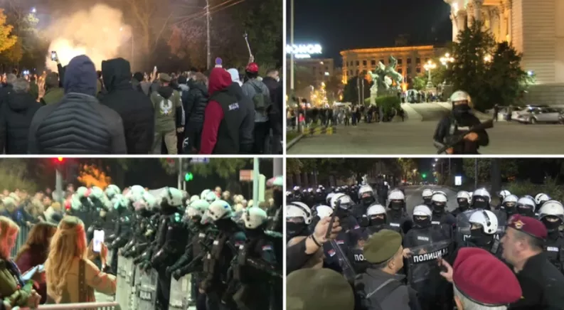 Grupa maskiranih osoba iz "ćacilenda" baca stolice, flaše vode i pirotehnička sredstva i palice.