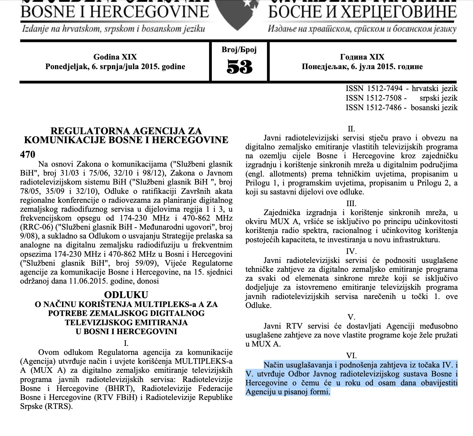 Način usaglašavanja i podnošenja zahtjeva iz tačaka IV. iV. utvrđuje Odbor Javnog radio-televizijskog sistema Bosne i Hercegovine o čemu će u roku od osam dana obavijestiti Agenciju u pisanoj formi", piše u Odluci iz 2015. godine.