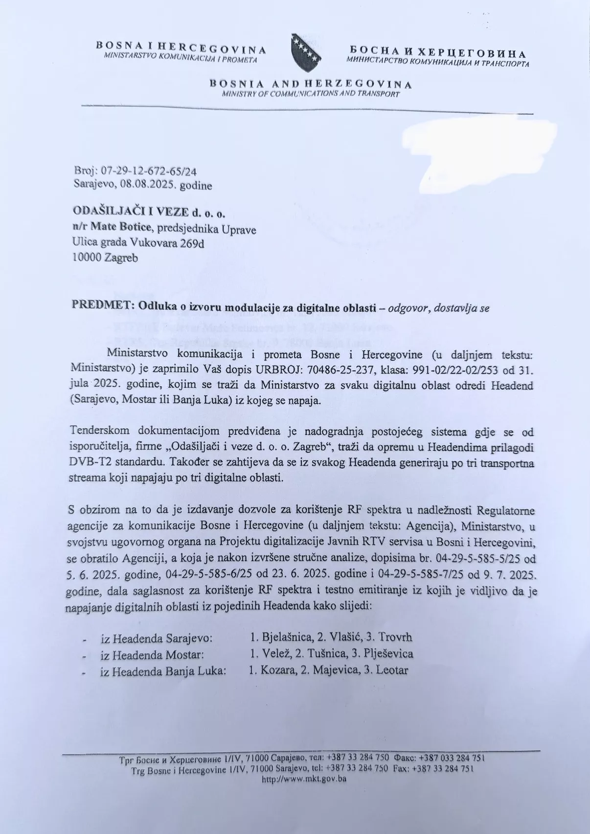"Ministarstvo, a u svojstvu ugovornog organa na Projektu digitalizacije Javnih RTV servisa u BiH, obratilo se Agenciji (RAK-u), koja je nakon izvršene stručne analize dala saglasnost za korištenje RF spektra i testno emitiranje iz kojih je vidljivo da je napajanje digitalnih oblasti iz pojedinih Headenda (centralne tačke distribucije signala) kako slijedi:
