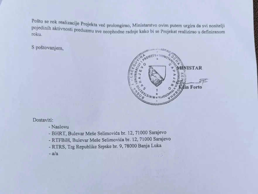 Pošto se rok realizacije projekta već prolongirao, Ministarstvo ovim putem urgira da svi nositelji pojedinih aktivnosti preduzmu sve neophodne radnje kako bi se projekat realizirao u definiranom roku", napisao ministar Forto u svom dopisu od 8. avgusta 2025. godine.