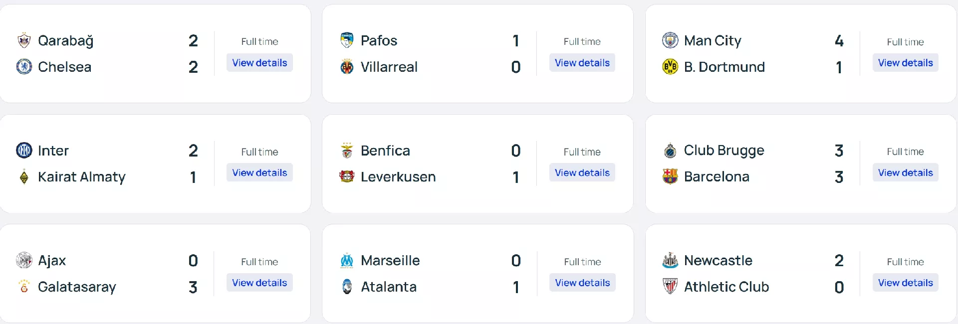 Italijanski Inter na svom je terenu savladao Kairat s 2:1. Za blaga iznenađenja gostujućim pobjedama pobrinuli su se Galatasaray i Bayer Leverkusen. Turci su pobijedili Ajax sa 3:0, a Apotekari Benficu sa 1:0.