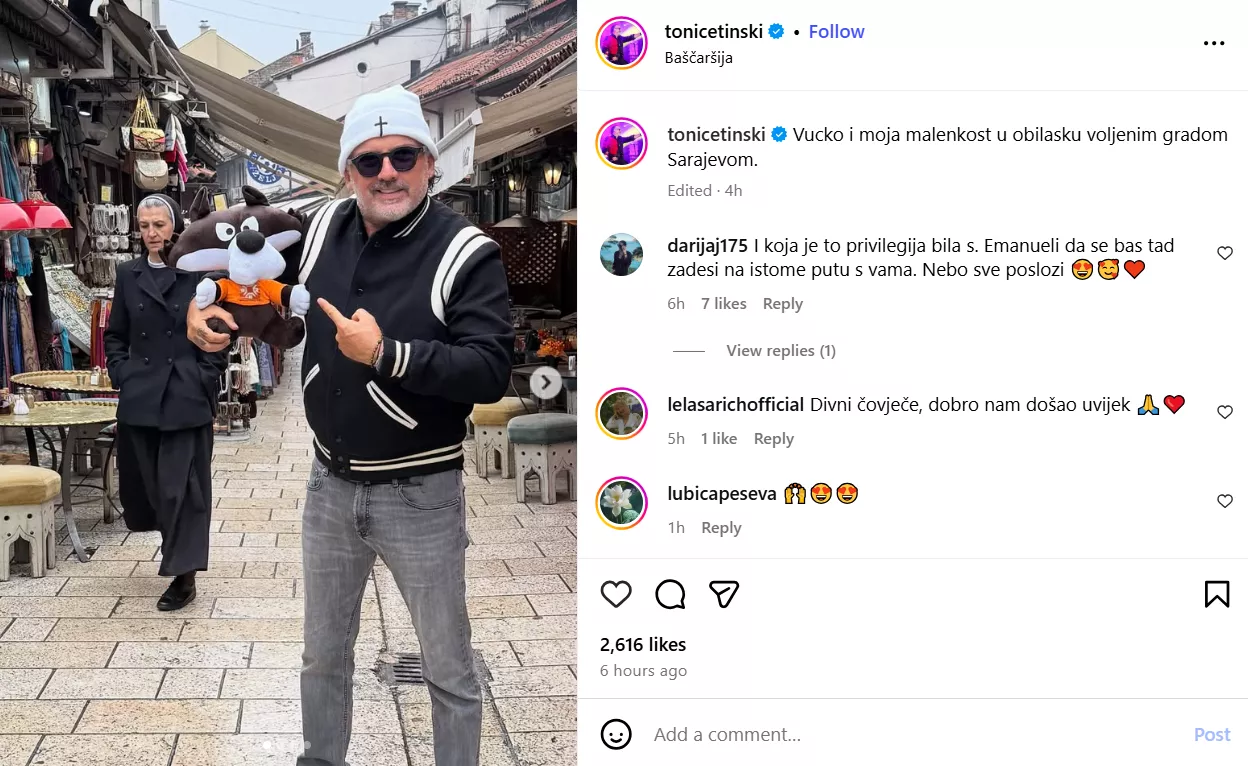 (Patria) - Poznati pjevač Tony Cetinski prošetao je Sarajevom u društvu legendarne maskote Vučka.