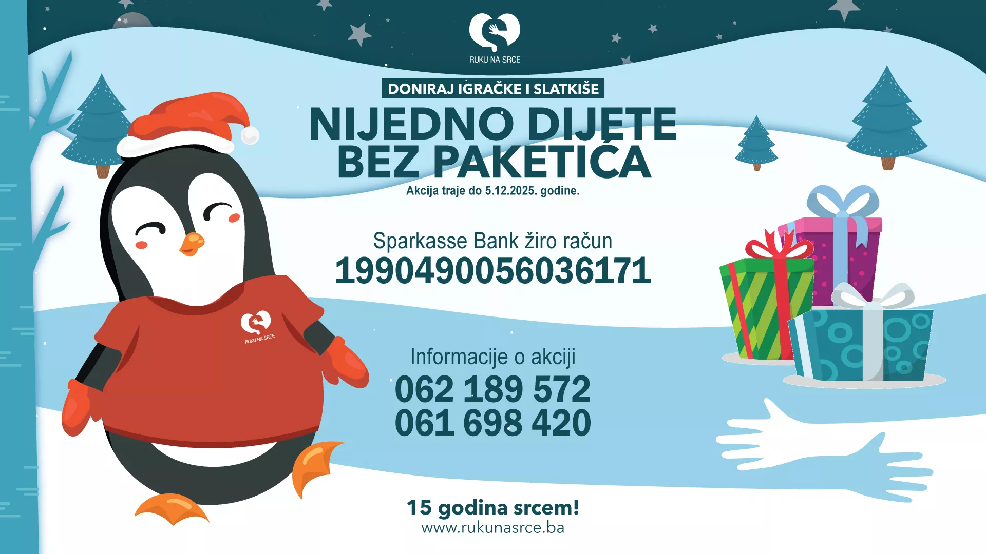 Upravo zbog toga, kako bi ova priča bila uspješna kao i pretodnih godina, Udruženje “Ruku na srce” poziva studente, školarce, sugrađane i predstavnike kompanija, udruženja i sportskih kolektiva da nas podrže i pomognu nam da ni jedan mališan ne bude bez novogodišnjeg paketića.