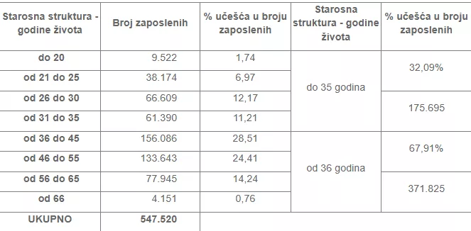 Prema službenim evidencijama Porezne uprave Federacije BiH na dan 31.10.2025. godine do 35 godina života zaposleno je 175.695, ili 32,09% zaposlenika, a preko 36 godina života zaposleno je 371.825 ili 67,91% zaposlenika. Na dan 31.10.2025. godine zaposleno je 304.059 ili 55,53% % muškaraca i 243.461 ili 44,47 % žena.