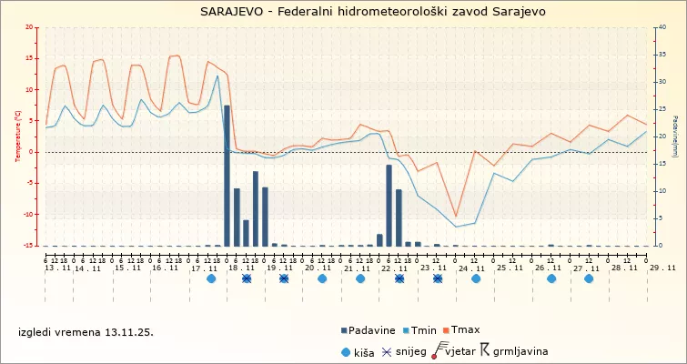 Jutarnje temperature zraka od utorka varirat će između -2 i 4 u Bosni do 8°C na jugu Hercegovine. Maksimalne temperature između 2 i 8 u Bosni do 11°C u Hercegovini.