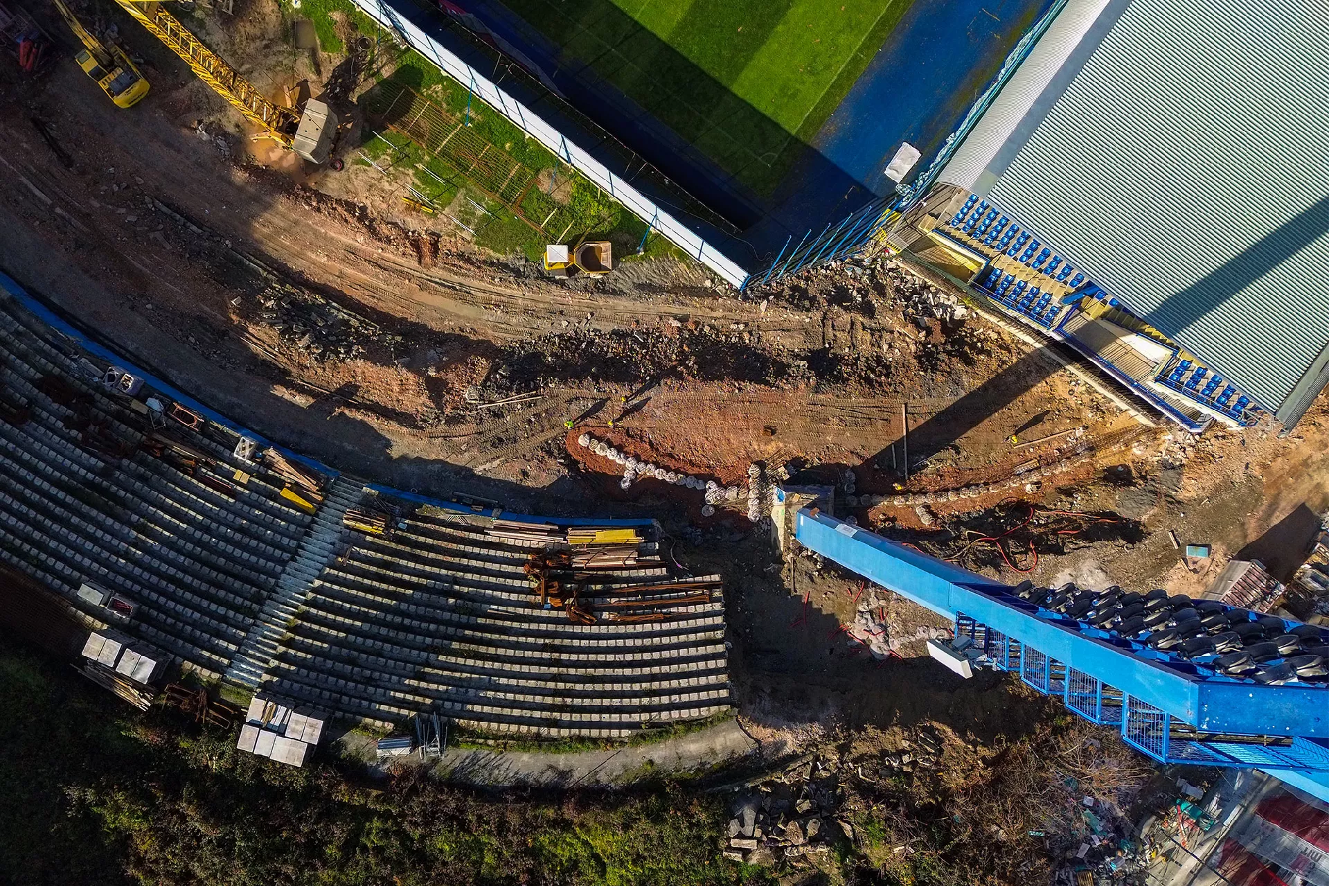 Istovremeno, započete su aktivnosti na izradi naglavne grede na jugoistoku, koja povezuje prethodno izvedene šipove i predstavlja ključnu fazu prije izvođenja nadzemnih konstruktivnih elemenata tribine.