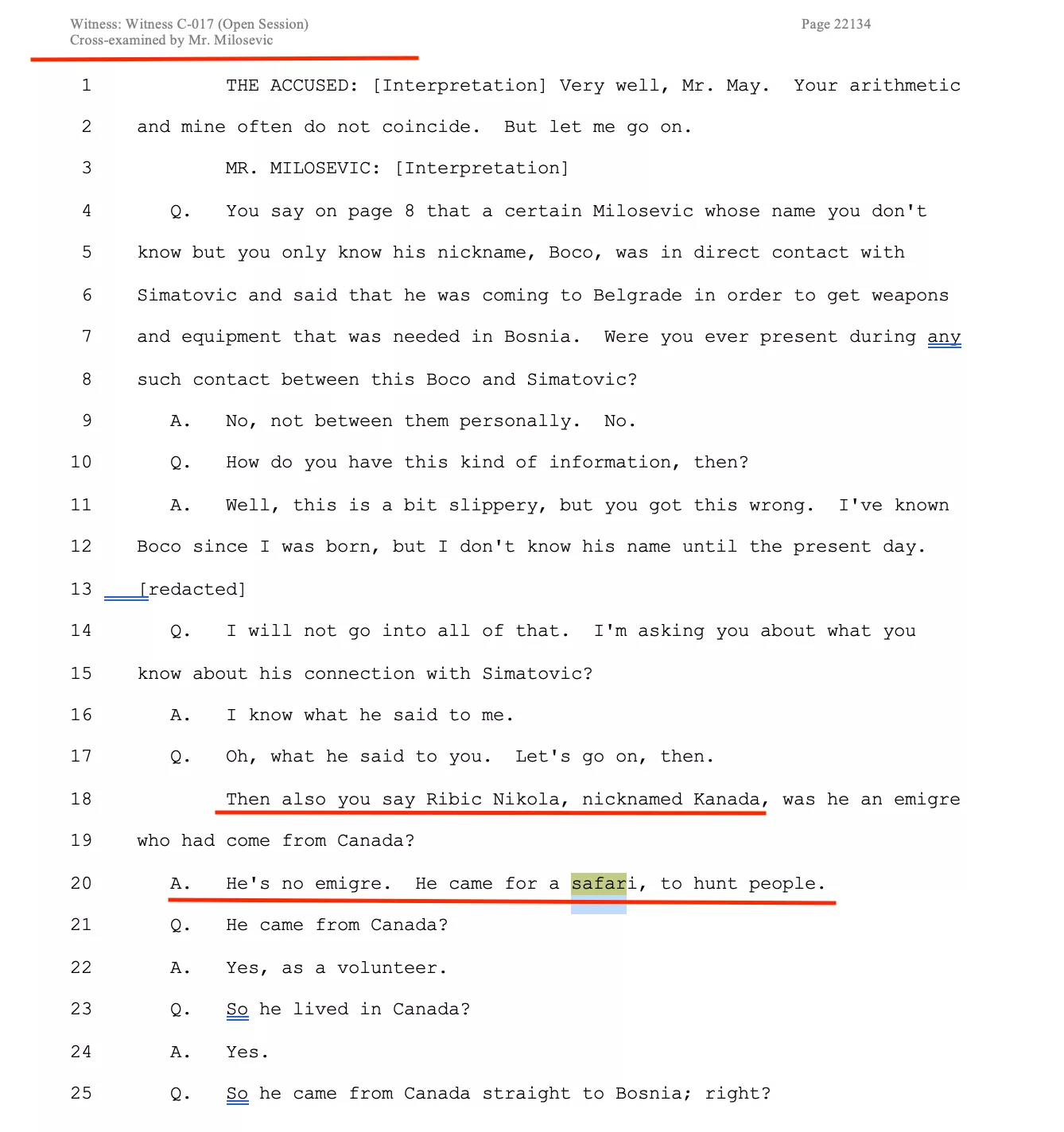 (Patria) - Kanadski državljanin Nickolas Nick Ribić tokom agresije na BiH došao je na “safari u Sarajevo” kako bi ubijao ljude. Potvrdio je je to zaštićeni svjedok C-017 na suđenju Slobodanu Miloševiću pred Haškim tribunalom. Zaštićeni svjedok je to kazao na javnom dijelu suđenje 11. juna 2003. godine.