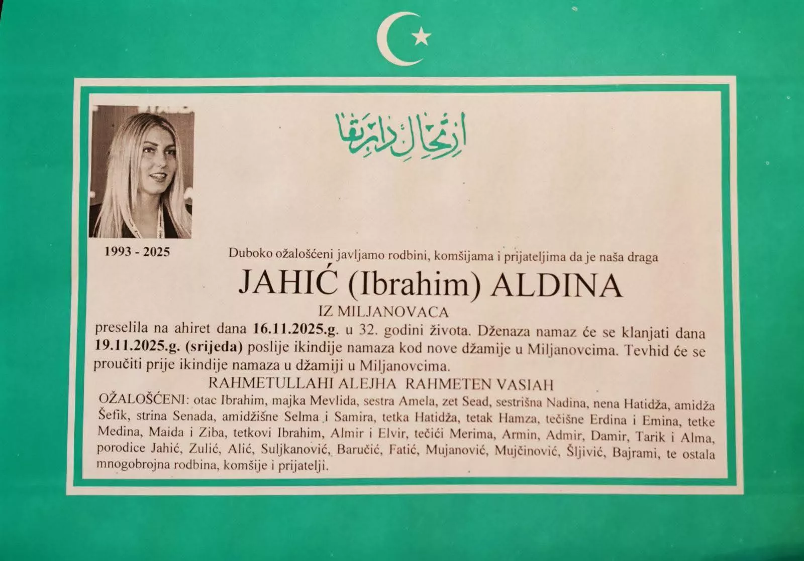 Dženaza namaz Aldini Jahić klanjat će se sutra poslije ikindije namaza kod nove džamije u Miljanovcima.
