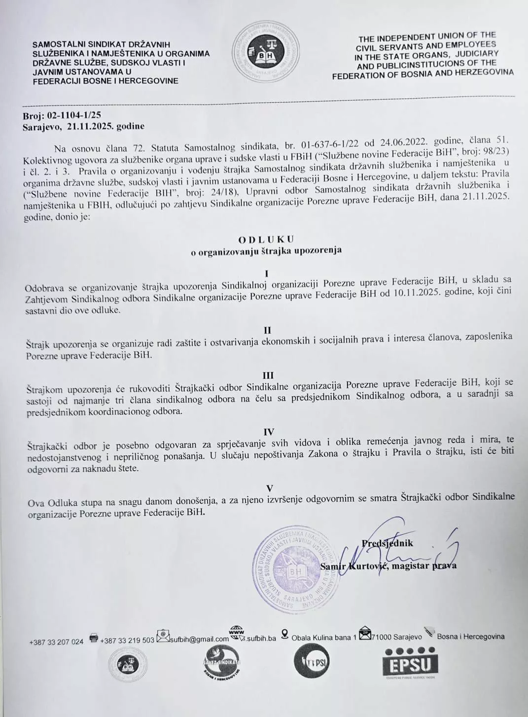 "Odobrava se organizovanje štrajka upozorenja Sindikalnoj organizaciji Porezne uprave FBiH, u skladu sa Zahtjevom Sindikalnog odbora Sindikalne organizacije Porezne uprave FBiH od 10.11.2025. godine", navodi se u odluci.