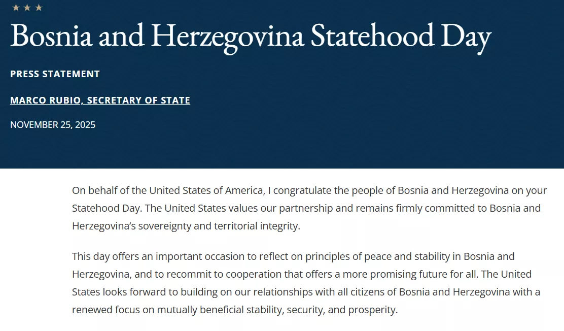"U ime Sjedinjenih Američkih Država, čestitam narodu Bosne i Hercegovine Dan državnosti. Sjedinjene Američke Države cijene naše partnerstvo i ostaju čvrsto posvećene suverenitetu i teritorijalnom integritetu Bosne i Hercegovine. Ovaj dan pruža važnu priliku da razmislimo o principima mira i stabilnosti u Bosni i Hercegovini i da se ponovo posvetimo saradnji koja nudi obećavajuću budućnost za sve. Sjedinjene Američke Države se raduju izgradnji naših odnosa sa svim građanima Bosne i Hercegovine s obnovljenim fokusom na obostrano korisnu stabilnost, sigurnost i prosperitet", rekao je Rubio.
