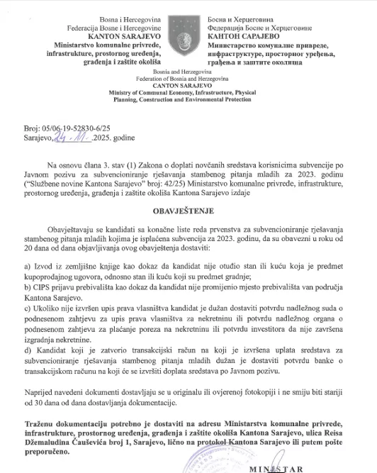 "Kandidat koji je ostvario pravo na subvenciju po Javnom pozivu i nalazi se na konačnoj listi reda prvenstva kandidata za subvencioniranje rješavanja stambenog pitanja mladih, broj 05/01-19- 44617-5/25 od 25.12.2023. godine, za doplatu novčanih sredstava dužan je dostaviti: