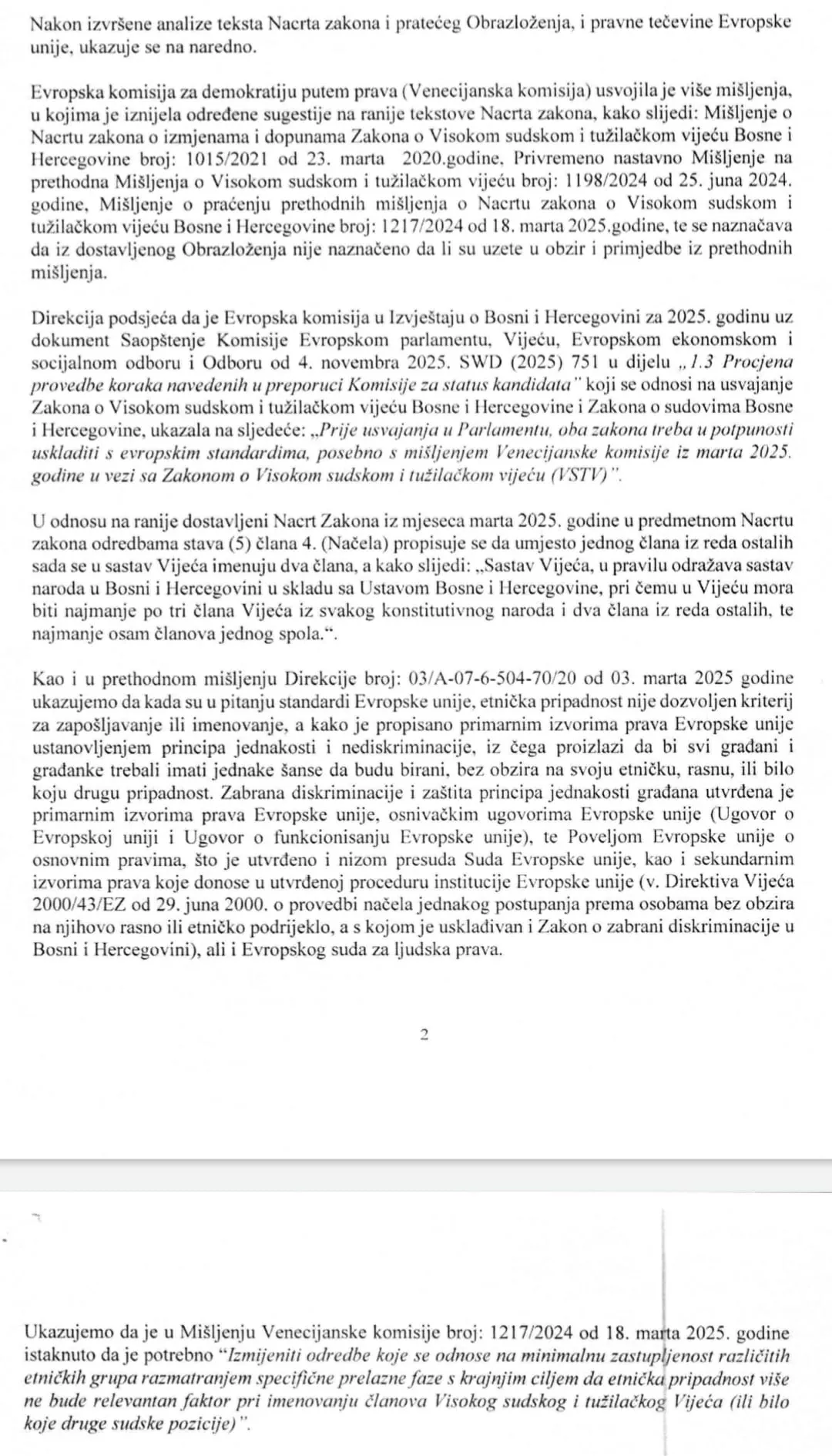 U mišljenju Evropske komisije prvi princip izbora članova VSTV-a je stručnost, a ne etnička struktura, dok je ovim Nacrtom prioritet dat nacionalnoj strukturi VSTV-a. O tome upozoravaju i iz Direkcije za evropske integracije.