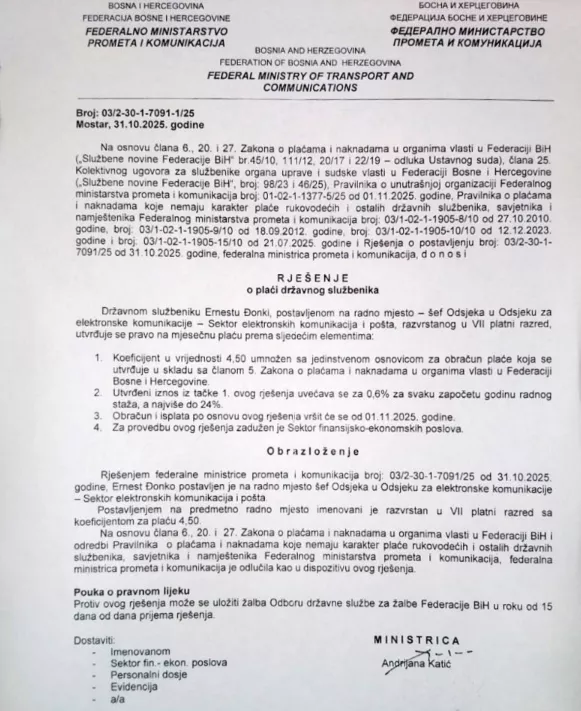 U dopisu Sindikata državnih službenika i namještenika FBiH od 26. studenoga 2025. godine, koji je dostavljen ministrici Katić, stoji: