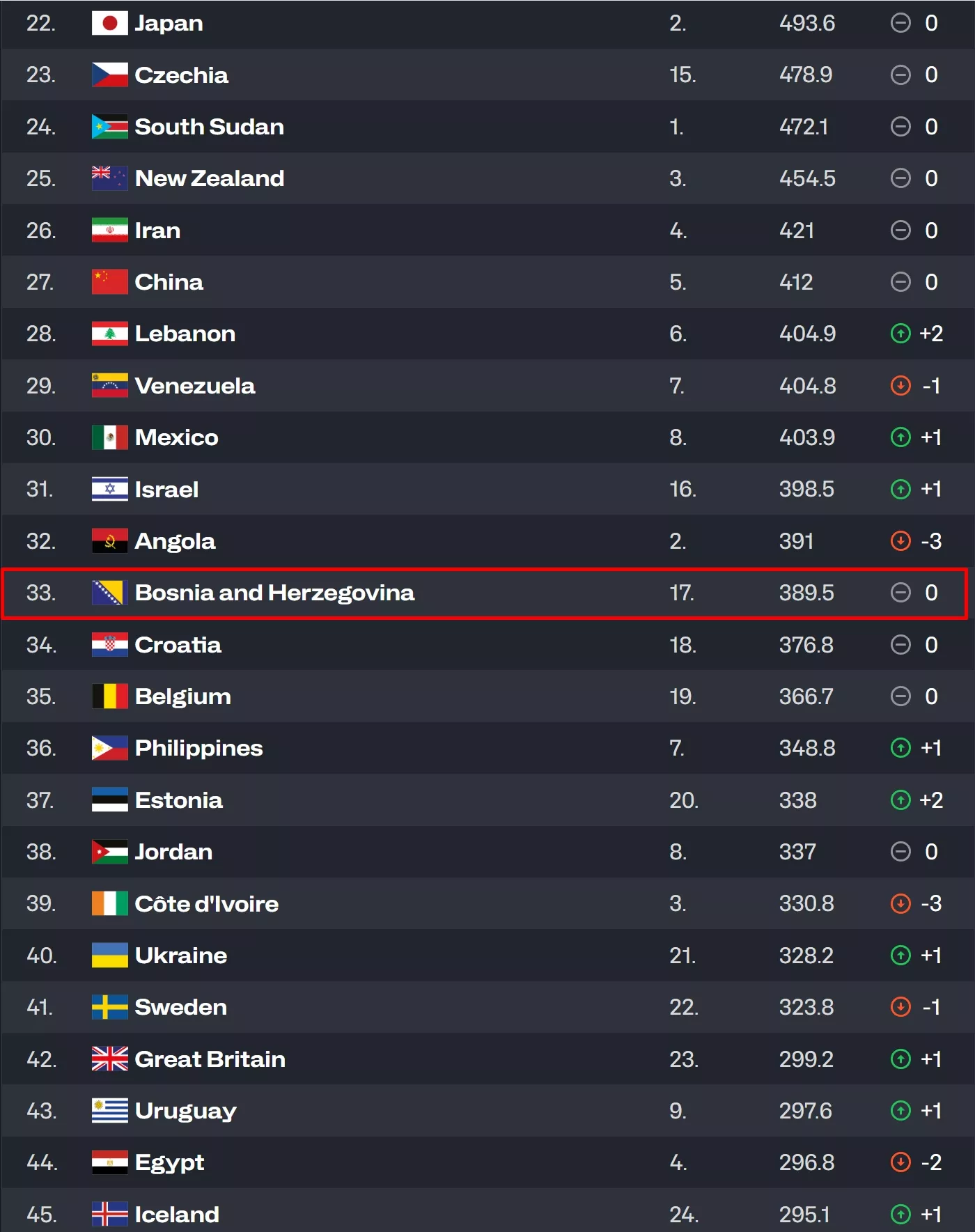 Reprezentacija Bosne i Hercegovine ostala je na 33. mjestu u svjetskom poretku, odnosno na 17. poziciji u Evropi. Naš nacionalni tim trenutno ima 389,5 bodova.