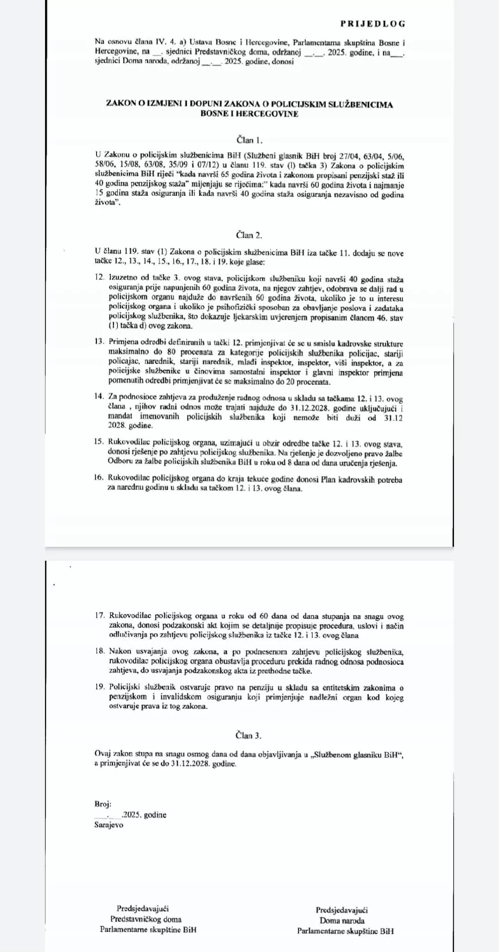 (Patria) - Iako su trojica predlagača izmjena i dopuna Zakona o policijskim službenicima BiH zatražila povlačenje sa sjednice 12. decembra zbog protivljenja sindikata tri državne policijske agencije koje su podnesene 24. novembra, od izmjena nisu odustali. Tako je danas protokolisan novi prijedlog Predraga Kojovića, Nihada Omerovića i Jasmina Imamovića u kojem je spuštena dobna granica sa 65 na 60 godina života da policijski službenik može obavljati dužnost, a zakon bi se primjenjivao do kraja 2028. godine. Bez obzira na korekcije, Sindikati nisu podržali ni ovaj prijedlog.