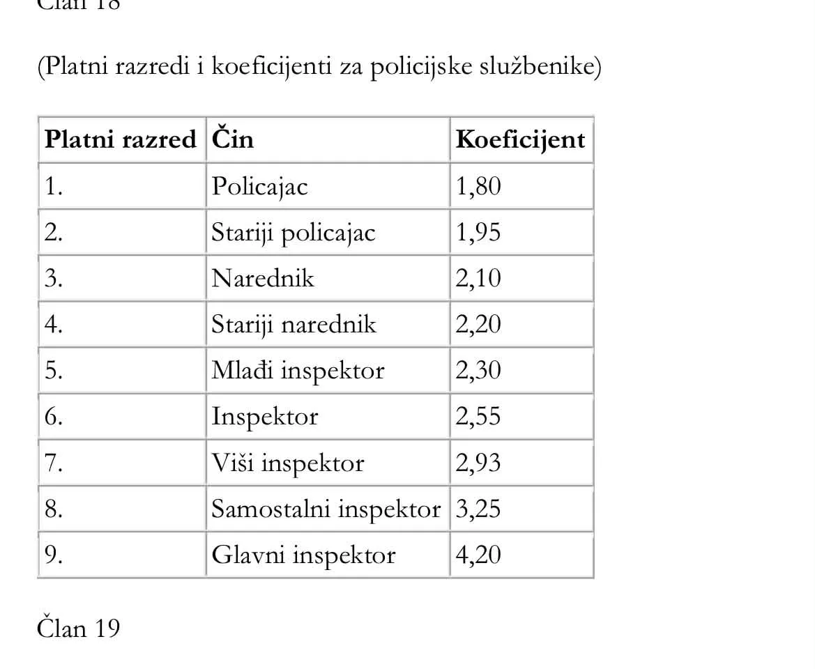 Koeficijenti za višeg inspektora, samostalnog inspektora i glavnog inspektora što su i najbolje plaćeni činovi uvećani su 0,17 za višeg, a po 0,20 za samostalnog i glavnog inspektora.