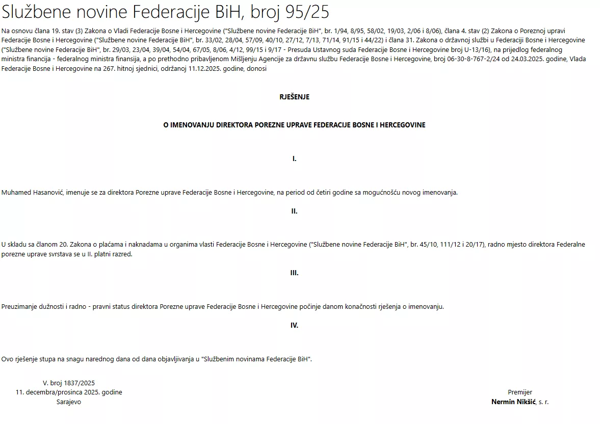 Ovo imenovanje je na čekanju od marta kada je Agencija za državnu službu FBiH okončala sve procedure, a Poreznom upravom FBiH rukovodio je po ovlaštenju Vlade FBiH Admir Omerbašić.
