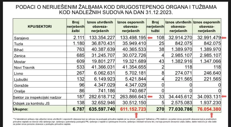 Prema dostupnim podacima, na dan 31.12.2023. broj neriješenih žalbi na rješenja Porezne uprave iznosi 6.787, a ukupni dug koji bi trebao biti naplaćen je 635.597.740 KM. Problem nastaje jer Ministarstvo finansija ne rješava žalbe u zakonskom roku od 30 dana, što je propisano Zakonom o upravnom postupku.
