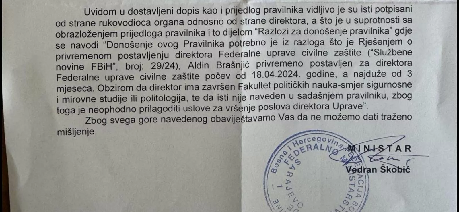 "Uvidom u dostavljeni dopis kao prijedlog pravilnika vidljivo je da su isti potpisani od strane rukovodioca organa, odnosno od strane direktora, što je u suprotnosti s obrazloženjem prijedloga pravilnika, i to dijelom 'Razlozi za donošenje pravilnika', gdje se navodi: 'Donošenje ovog pravilnika potrebno je iz razloga što je Rješenjem o privremenom postavljanju direktora Federalne uprave civilne zaštite Aldin Brašnjić privremeno postavljen za direktora počev od 18.04.2024. godine, a naduže do tri mjeseca.