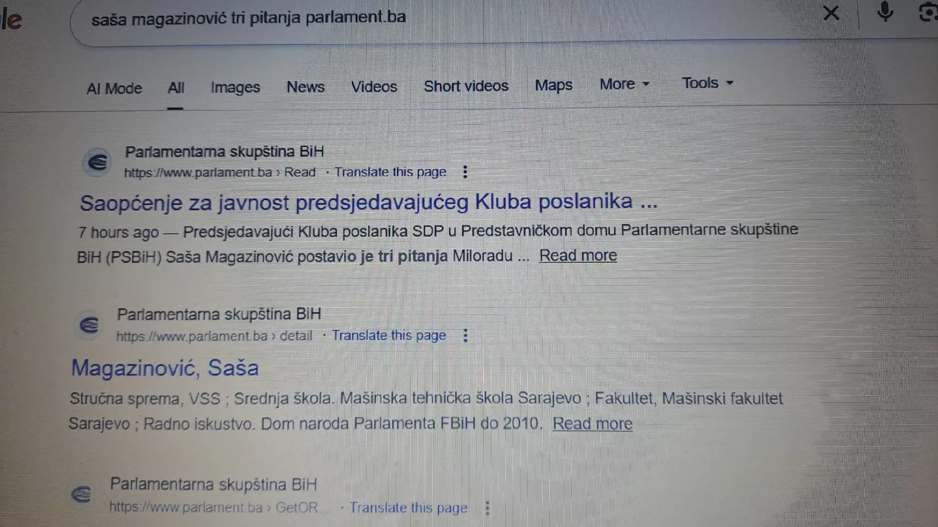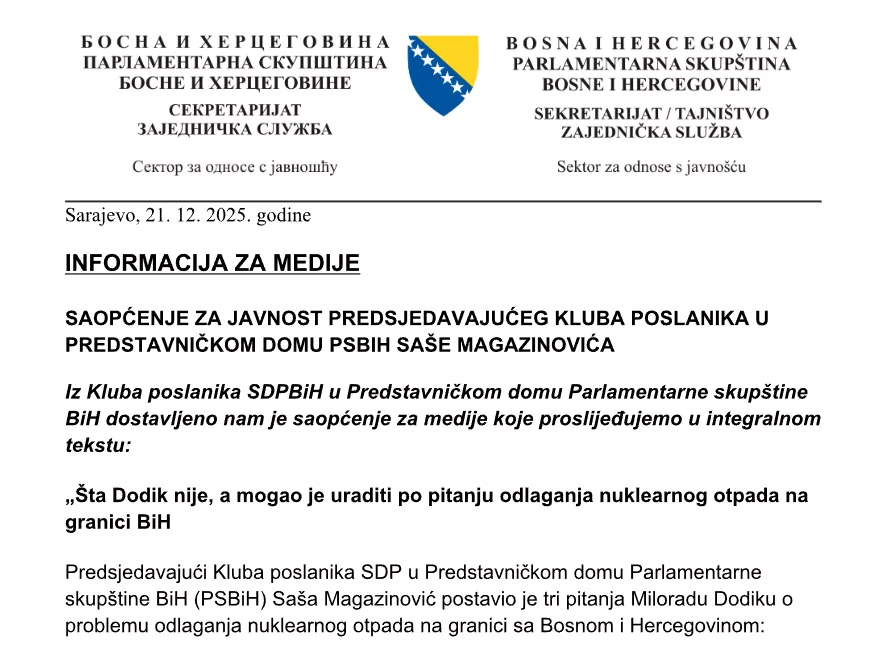 Na stranici Parlamenta BiH bilo je objavljeno saopćenje šefa Kluba SDP-a Saše Magazinovića u ovom domu koje je medijima poslano u nedjelju 21. decembra. Danas se to saopćenje ne može pronaći na stranici parlament.ba.