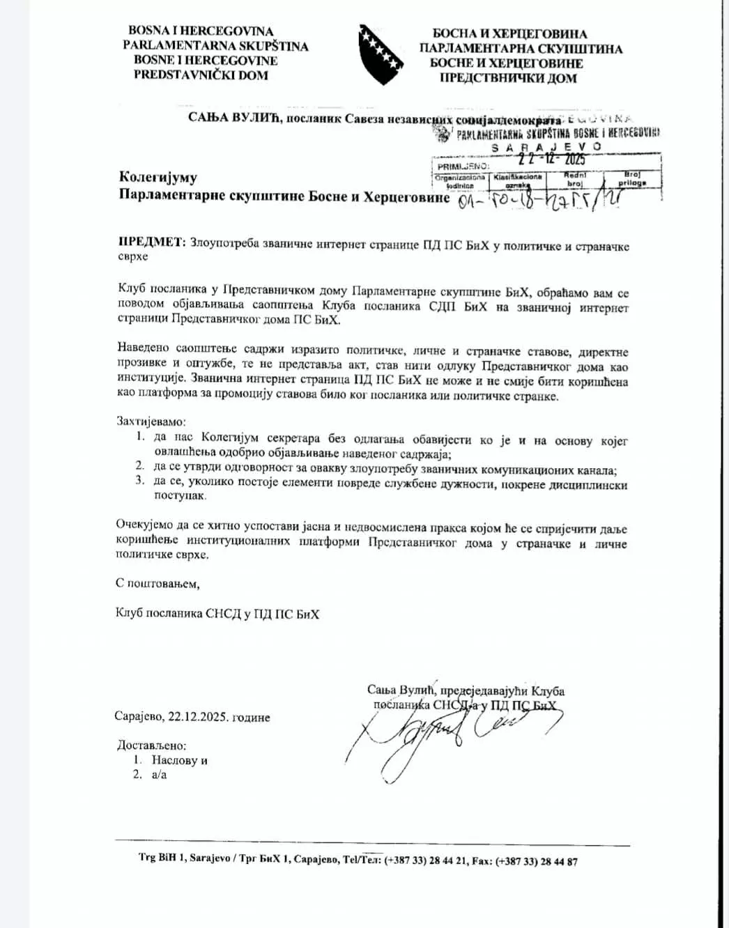 Dalje zahtijevaju da ih Kolegij obavijesti ko je i na osnovu kojeg ovlaštenja odobrio objavljivanje navedenog sadržaja, da se utvrdi odgovornost za zloupotrebu zvaničnih komunikacijskih kanala i da se, ukoliko postoje elementi povrede službene dužnosti, pokrene disciplinski postupak.