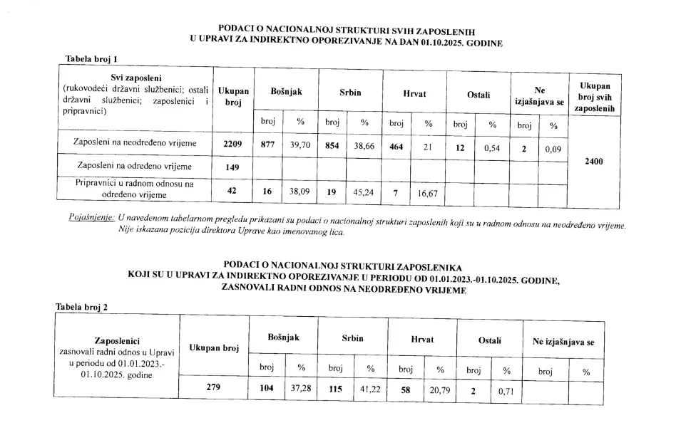 (Patria) - Broj zaposlenih u Upravi za indirektno oporezivanje BiH na dan 1. oktobar 2025. godine iznosio je 2.401 uključujući zaposlene na neodređeno, određeno i pripravnike. Iz UIO nisu dostavili podatke o nacionalnoj pripadnosti uposlenih na određeno vrijeme njih 149.