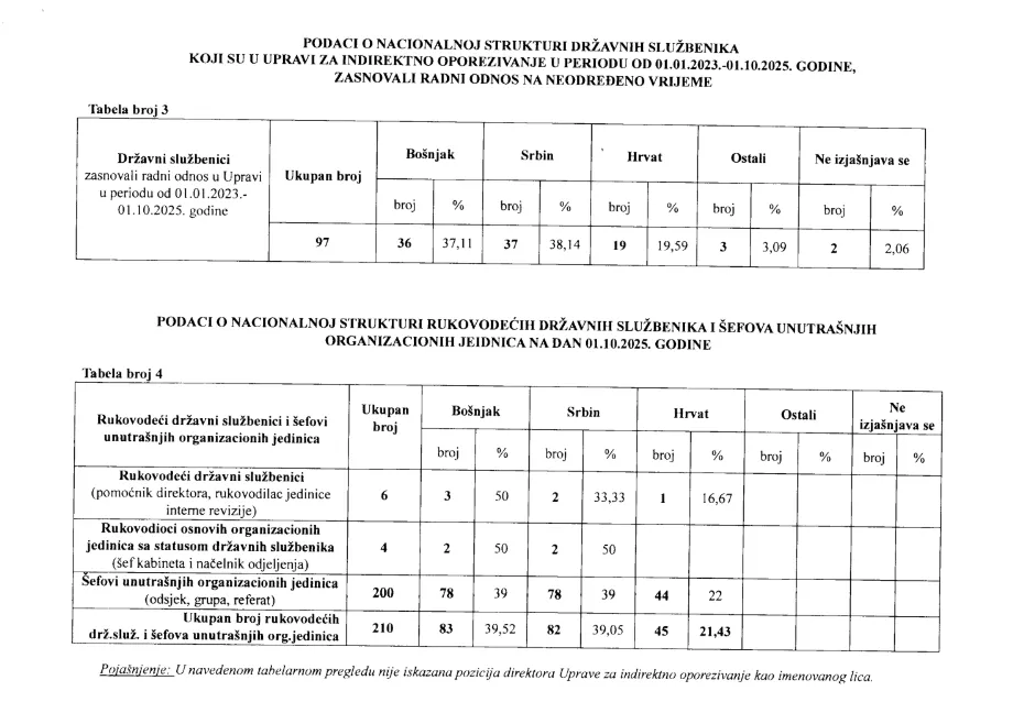 U periodu od januara 2023. do 1. oktobra 2025. godine radni odnos zasnovalo je 97 državnih službenika i to 36 Bošnjaka, 37 Srba, 19 Hrvata, troje ostalih i dvije osobe koje se ne izjašnjavaju. U istom periodu radni odnos je započelo i 279 uposlenika i to 104 Bošnjaka, 115 Srba, 58 Hrvata i dvoje iz reda Ostalih.