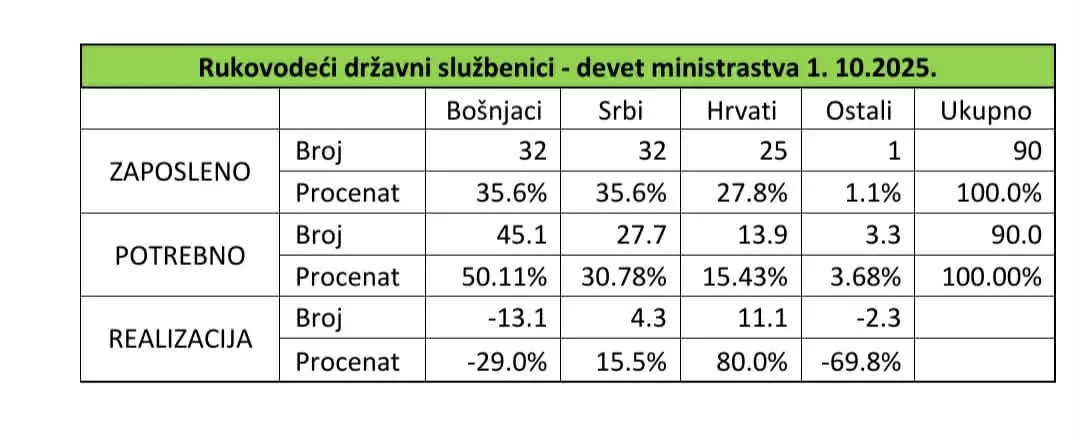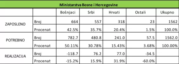 U devet državnih ministarstava Bošnjaci su na 32 rukovodeće pozicije, Srbi isto na 32, Hrvati na 25, a jedno iz reda Ostalih. Ako bismo se držali Popisa 2013, Bošnjaci imaju 13 pozicija manje, Srba je za četiri pozicije više, a Hrvati imaju 11 pozicija više, dok nedostaju dva iz reda ostalih.
