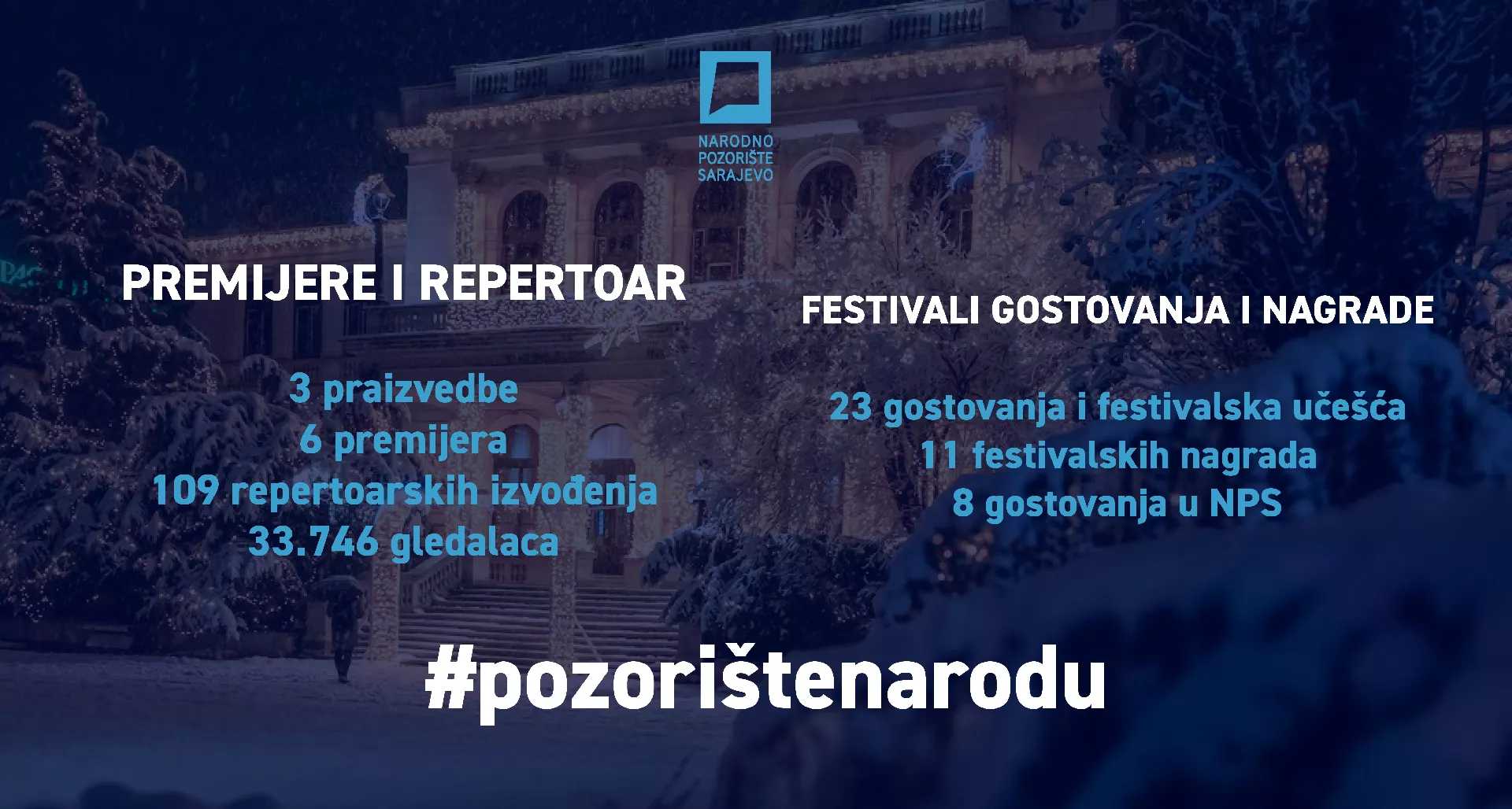Iz Narodnog pozorišta ističu da su ugostili umjetnike regionalnih teatara, bili domaćini brojnim festivalima, događajima i koncertima. Praizveli su tri domaća naslova „Sarajevski trgovac“, „Na slovo F“ i mjuzikl „Sarajevo, moje drago“.