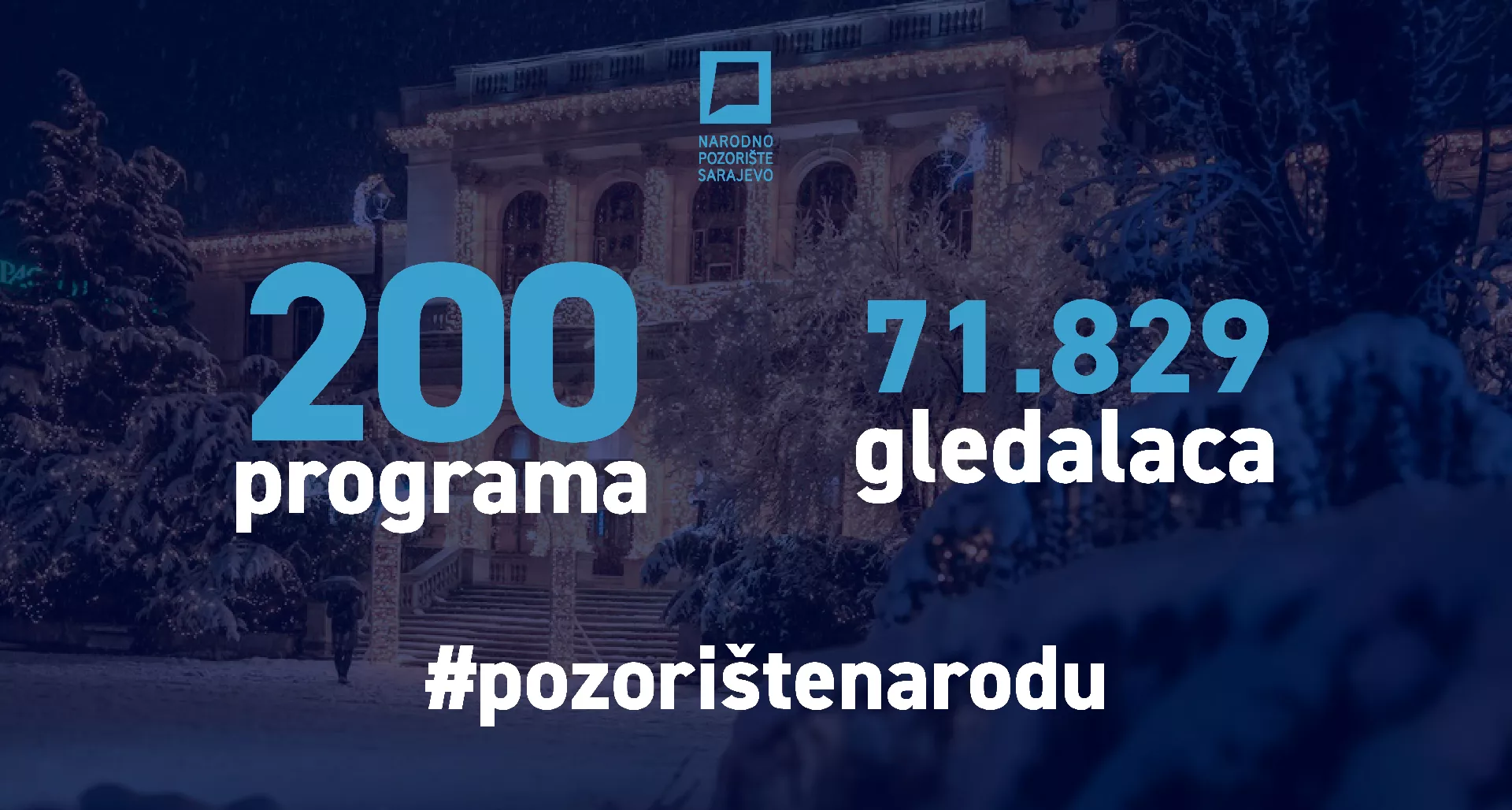 Programe Narodnog pozorišta Sarajevo posjetilo je ukupno 71.829 gledalaca, a na specijalnim programima „Kultura na ulice!“ i „Pozorište na kućnoj adresi“ producirano je 40 programa, koje je posjetilo 32.083 gledalaca ljubitelja umjetnosti.