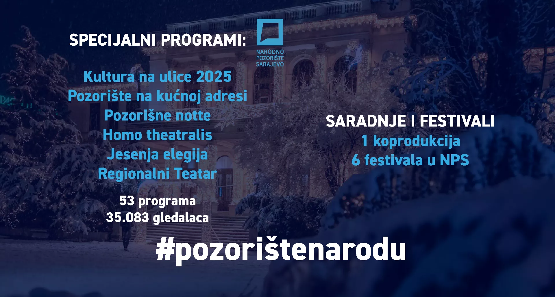 Publika je mogla uživati u specijalnim programima Narodnog pozorišta Sarajevo „Kultura na ulice 2025!“, „Pozorište na kućnoj adresi“, „Pozorišne notte“, „Homo theatralis“, „Jesenja elegija“, „Regionalni teatar“ te „Kaleidoskop teatra kroz objektiv mladih“.