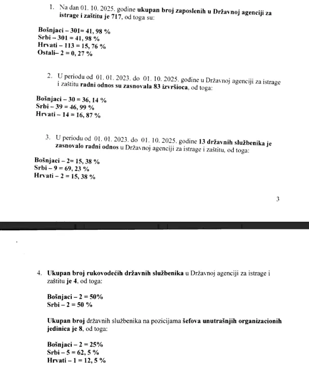 U periodu od januara 2023. do oktobra 2025. godine u SIPA-u su primljena 83 izvršioca i to 30 Bošnjaka, 39 Srba, 14 Hrvata. Primljeno je i 13 državnih službenika i to dva Bošnjaka, devet Srba i dvoje Hrvata.