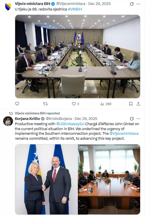 Zašto su na istom zvaničnom X nalogu, u periodu od 1. juna do 28. decembra 2025. godine također sve objave koje se odnose na sjednice Vijeia ministara, ukupno 39, također na hrvatskom jeziku? Hoće li Vijeće ministara utvrditi ko je odgovoran za ovakvu zloupotrebu zvaničnog komunikacijskog kanala i sankcionirati odgovorne?", navodi Mehmedović u svom upitu.
