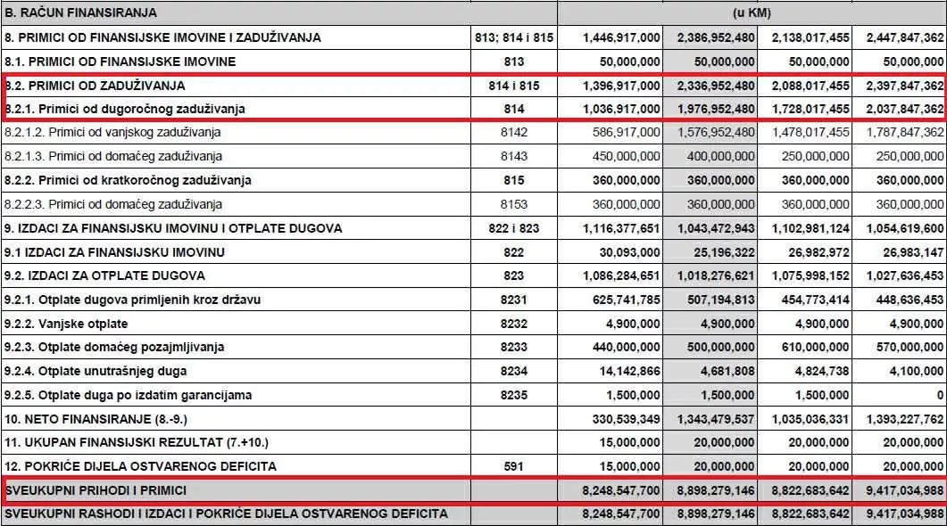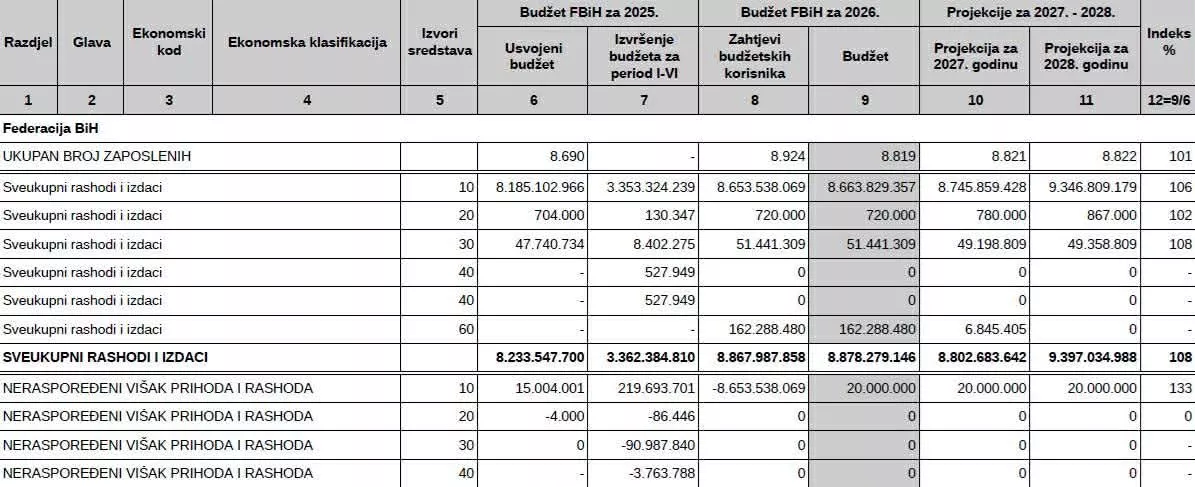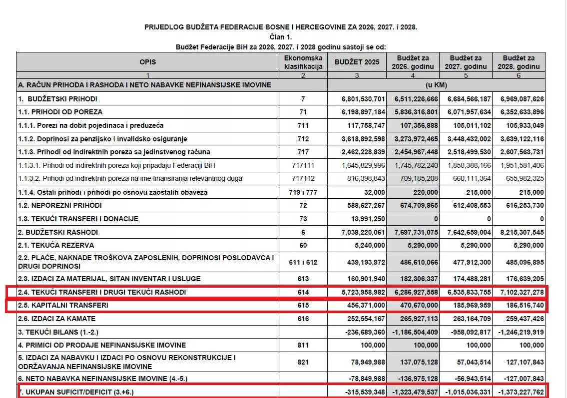 U 2026. godini planirani su ukupni prihodi/rashodi od 6,51 milijardi maraka i deficit u iznosu od 1,32 milijarde.