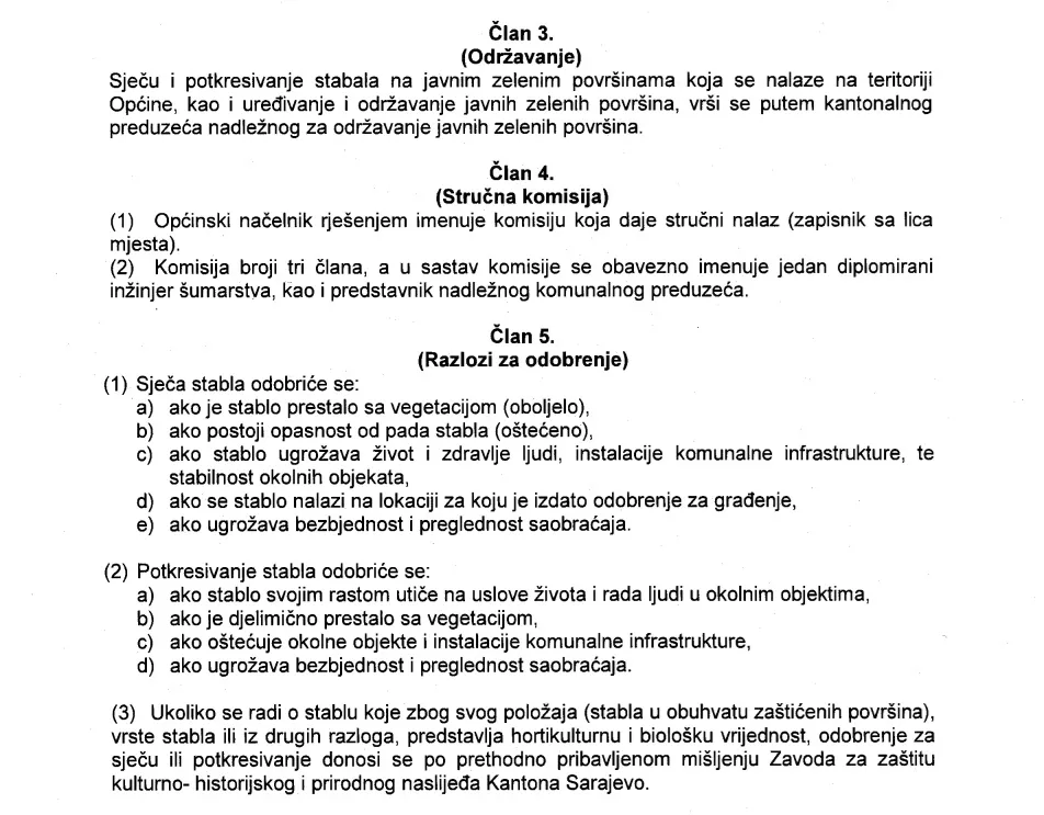 Prije nego se odobri sječa, načelnik (ili u ovom slučaju načelnica - Benjamina Karić) imenuje tročlanu stručnu komisiju koja izlazi na teren i daje stručni nalaz. Odlukom su jasno propisani uslovi pod kojima se odobrava sječa stabala.