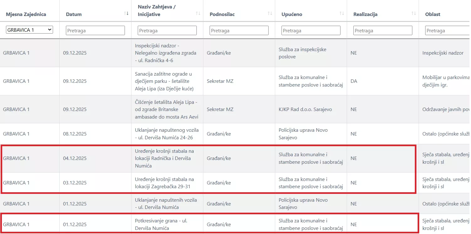 Na web stranici Općine Novo Sarajevo, na listi inicijativa i urgencija mjesnih zajednica, navodi se da je Mjesna zajednica Grbavica 1 tokom decembra 2025. slala brojne zahtjeve općinskim službama za potkresivanje grana i uređenje krošnji stabala na više lokacija. Nijedan od tih zahtjeva nije realizovan.