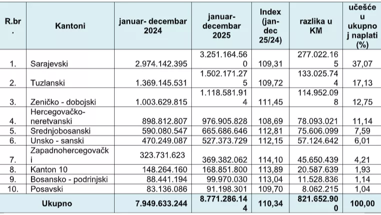 (Patria) - Porezna uprava Federacije BiH obavještava javnost da je naplata javnih prihoda u 2025. godini imala trend rasta i da su porezni obveznici Federacije BiH u periodu januar – decembar 2025. godine uplatili rekordnih 8.771.286.144 KM javnih prihoda, što je u odnosu na januar – decembar 2024. godine više za 821.652.900 KM, ili za 10,34 %.