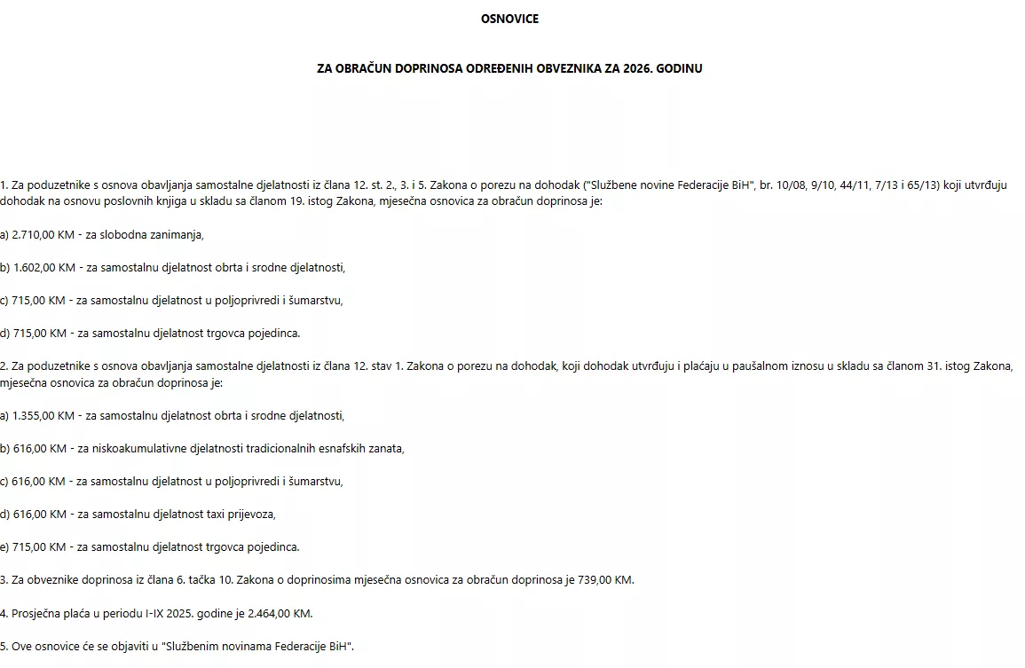 Kada je riječ o osnovici za obračun doprinosa, u odnosu na 2025. godinu došlo je do povećanja i to za obrtnike koji utvrđuju dohodak na osnovu poslovnih knjiga, osnovica doprinosa iznosi: 2.710,00 KM - za slobodna zanimanja (programeri, prevodioci, advokati...). U 2025. godini osnovica je iznosila 2.329 KM što je povećanje za 381 KM.